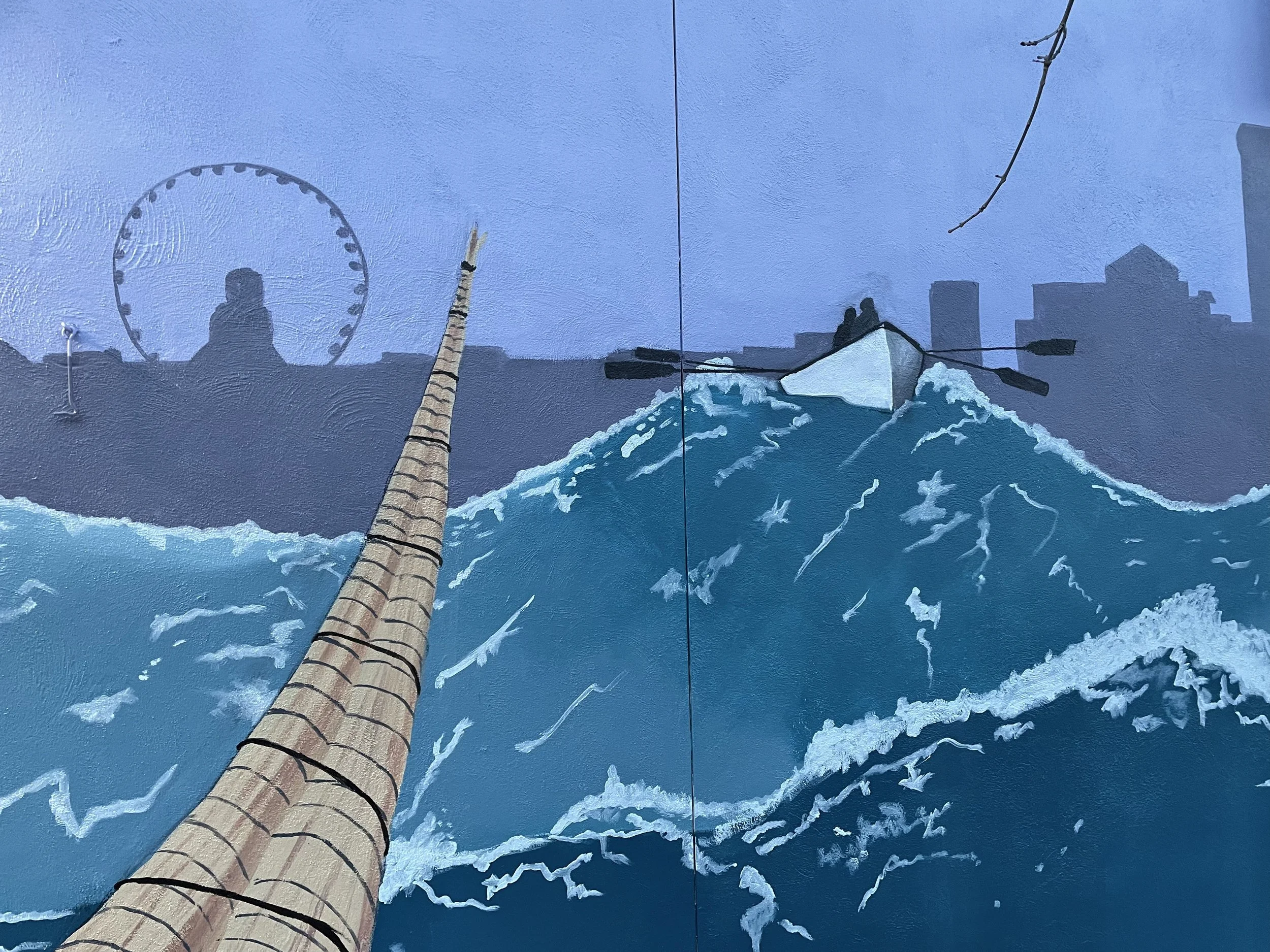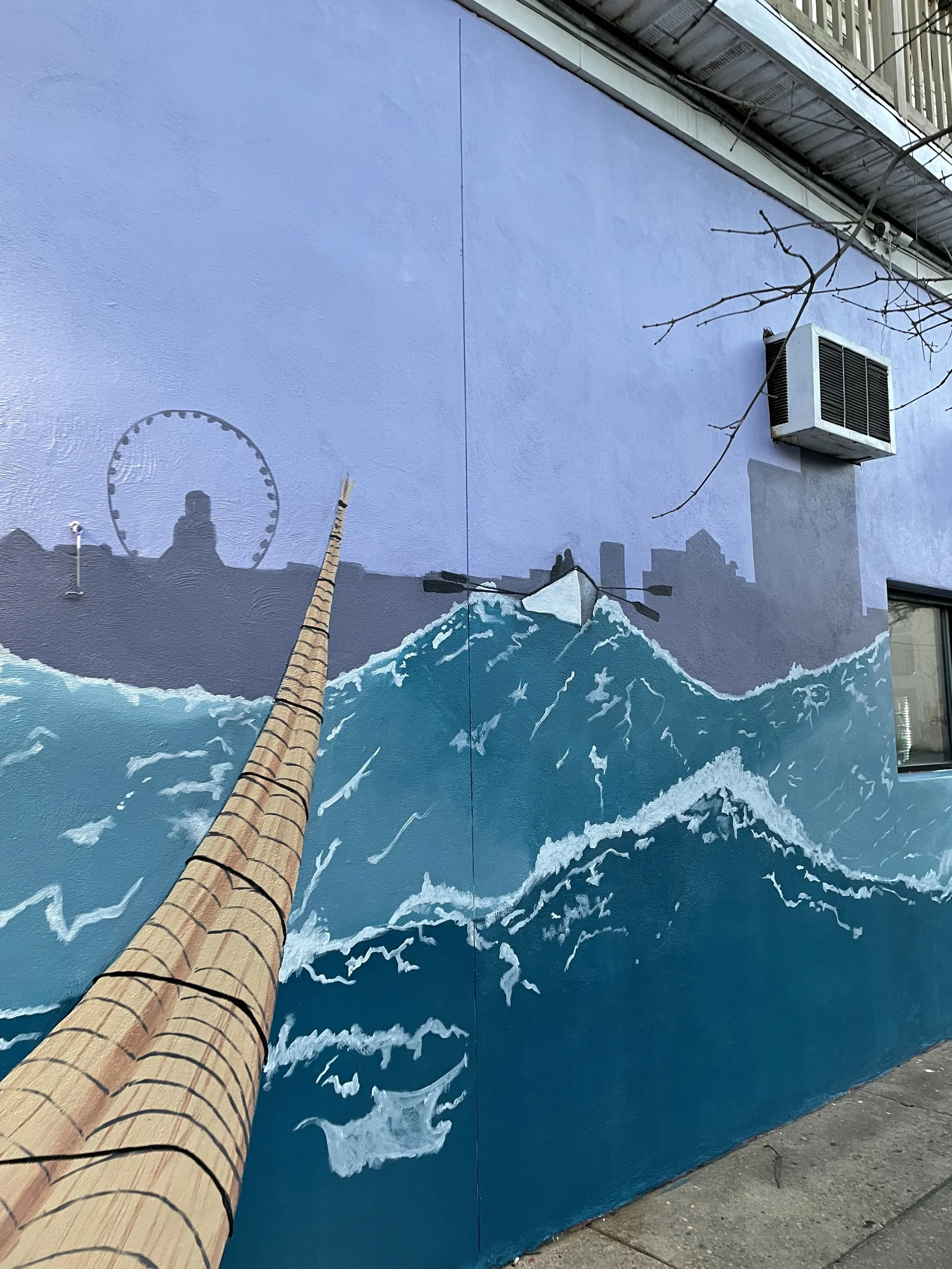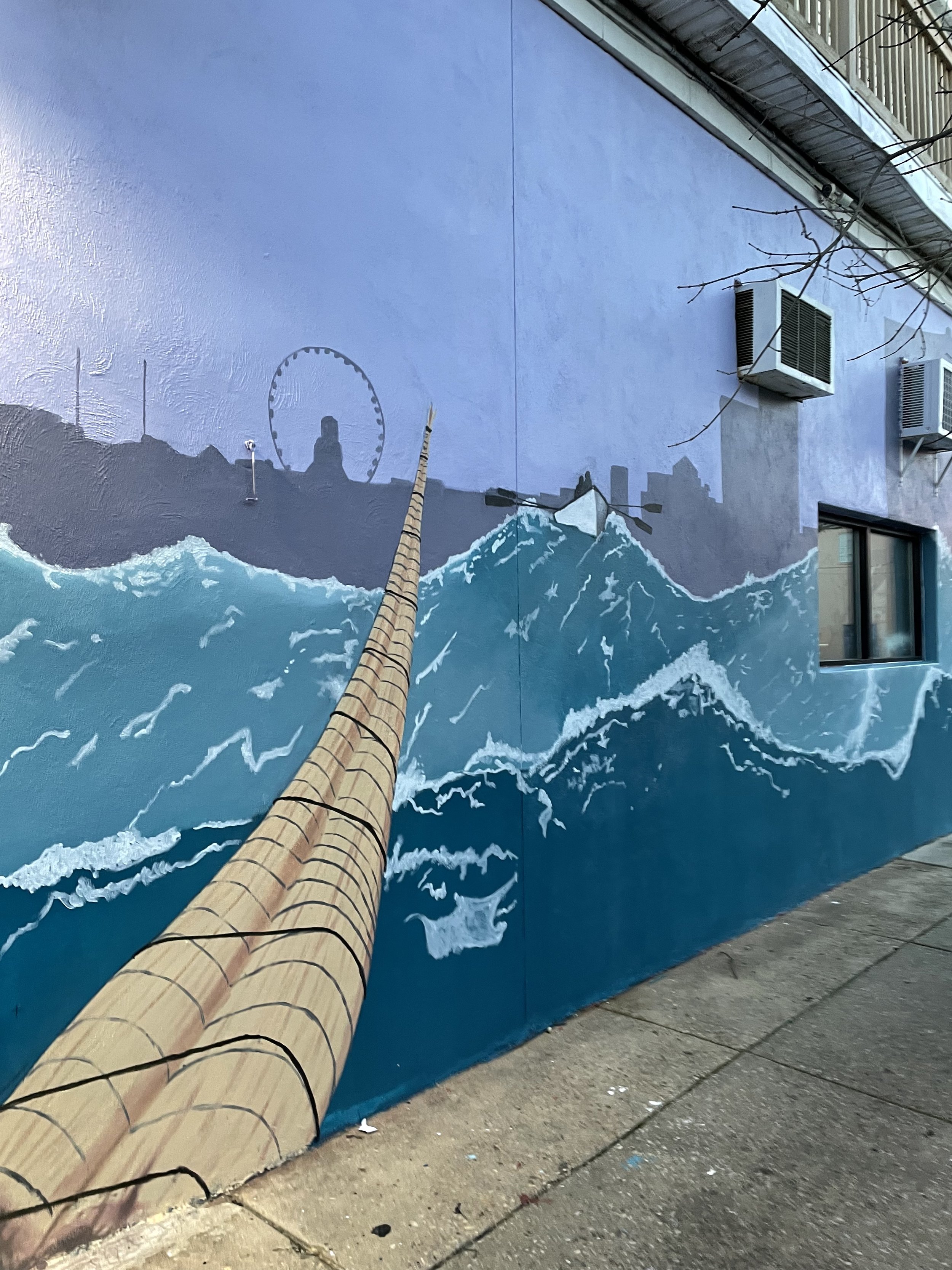 This mural shows a Caballito de Totora, a traditional Peruvian boat that has been built and passed down for 3,500 years and is still used today, meeting an Atlantic City lifeboat, a Van Duyne boat that has a long tradition for locals here. This scene features turbulent waves of change and redirection, but is grounded by the distant Atlantic City skyline. We hope the community can find themselves in the story of hope and adventure coming to this city and making it their home.