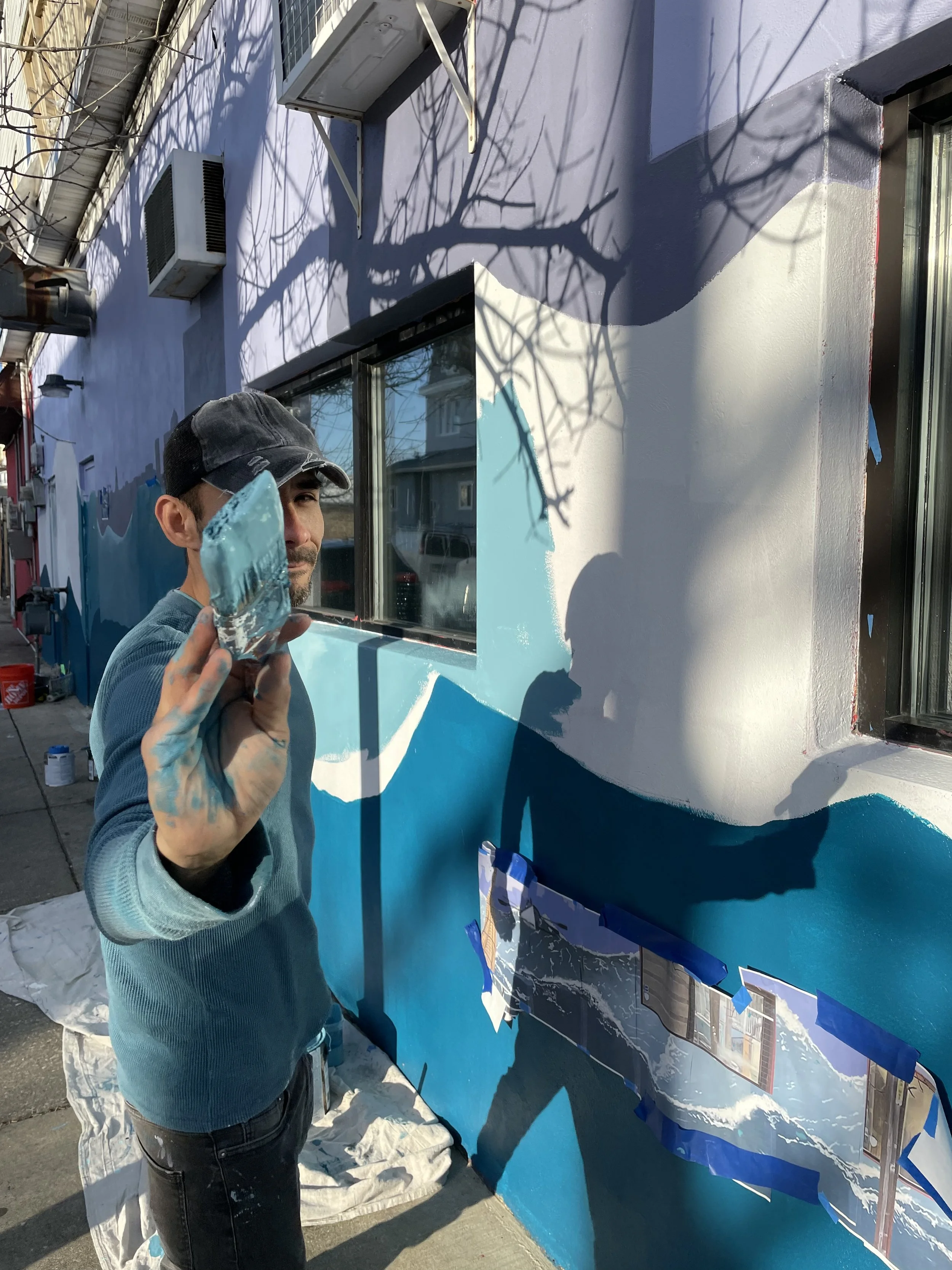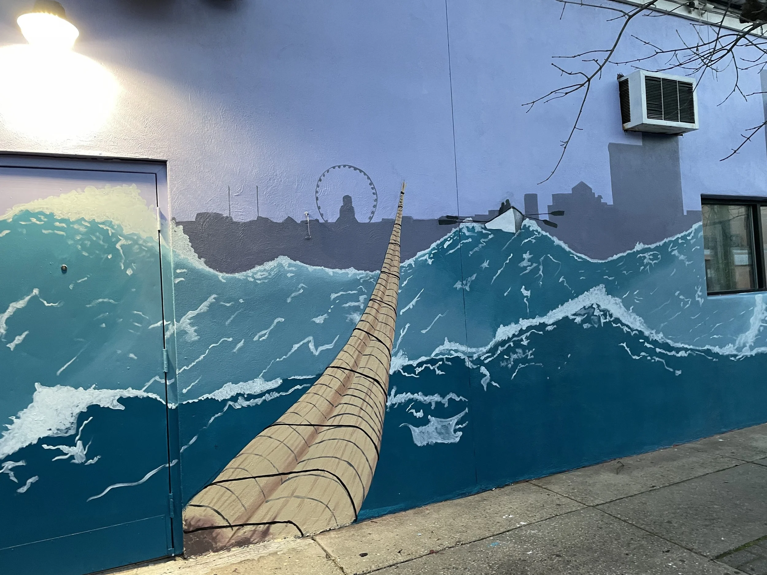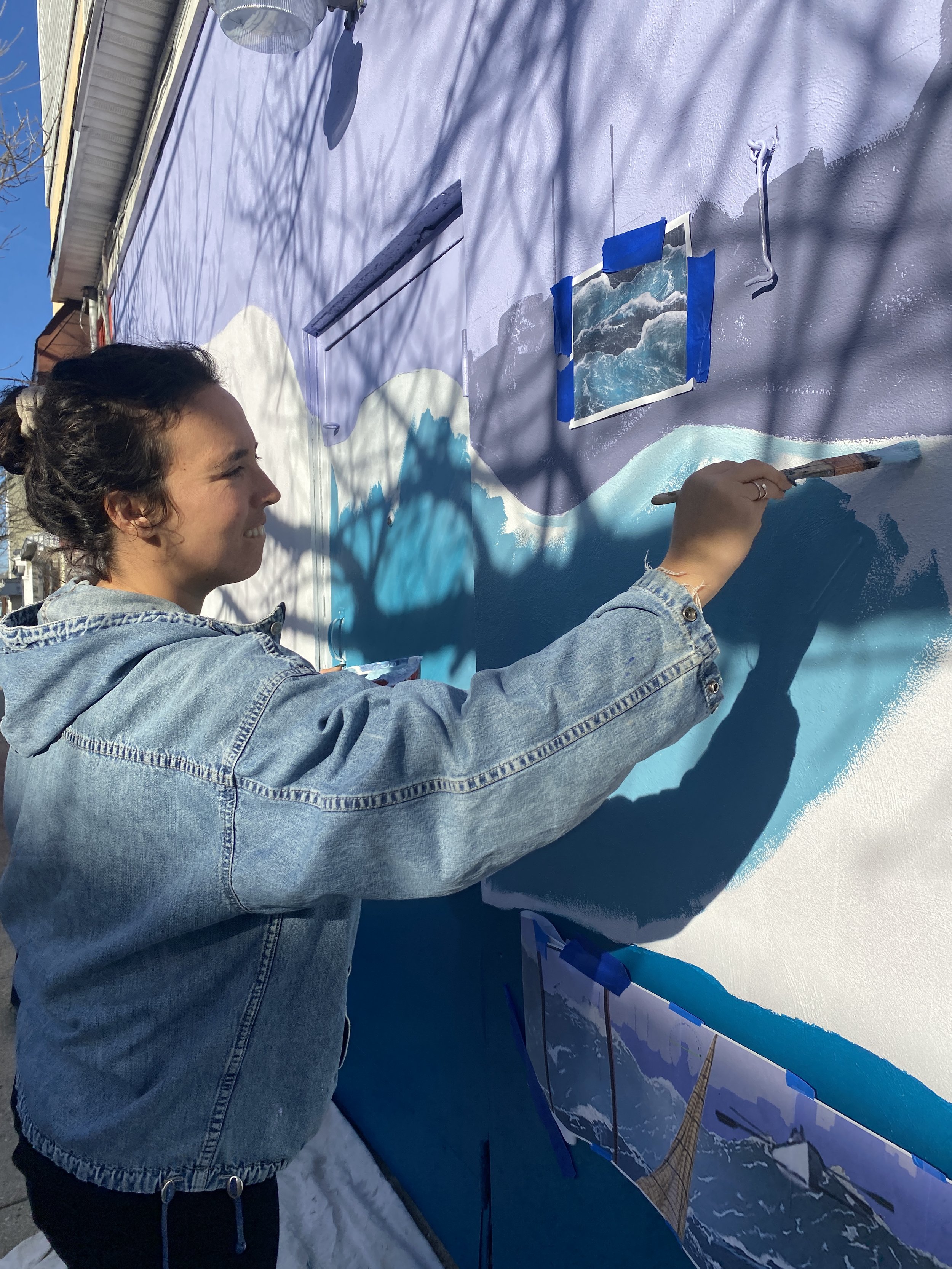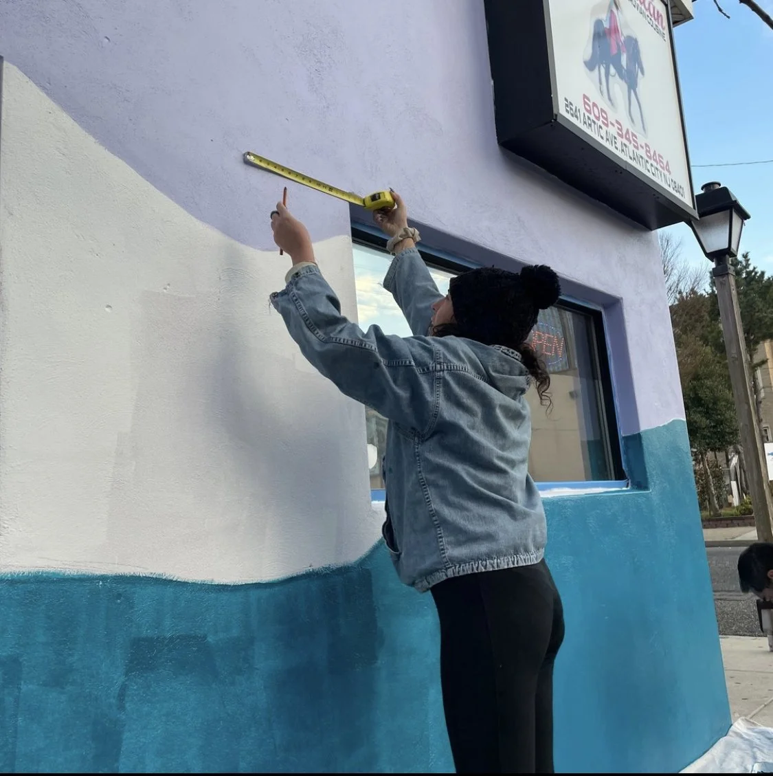 This mural shows a Caballito de Totora, a traditional Peruvian boat that has been built and passed down for 3,500 years and is still used today, meeting an Atlantic City lifeboat, a Van Duyne boat that has a long tradition for locals here. This scene features turbulent waves of change and redirection, but is grounded by the distant Atlantic City skyline. We hope the community can find themselves in the story of hope and adventure coming to this city and making it their home.